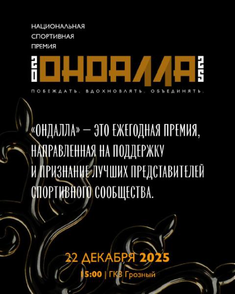 По инициативе министра Чеченской Республики по физической культуре и спорту Ахмата Кадырова в столице республики учреждена ежегодная Национальная спортивная премия «Ондалла», которая станет значимым событием в спортивной жизни региона и объединит ведущих представителей сферы физической культуры и спорта. Об этом сообщает пресс-служба ведомства.