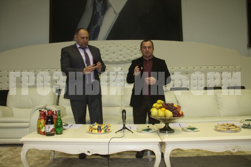 Делегация из Дагестана в знак уважения подарила Хасмагомеду Хизриеву, а также директору республиканского спортивного клуба "Ахмат" Саламбеку Исмаилову памятные знаки отличия.