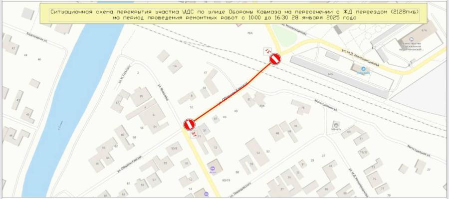 В связи с необходимостью проведения ремонтных работ 28 января с 10:00 до 17:00 будет временно перекрыто движение автотранспорта через железнодорожный переезд по улице Обороны Кавказа.