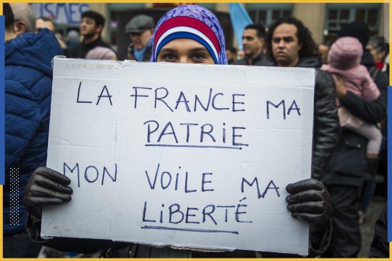 Надпись на плакате: «Франция — моя страна, хиджаб — моя свобода»