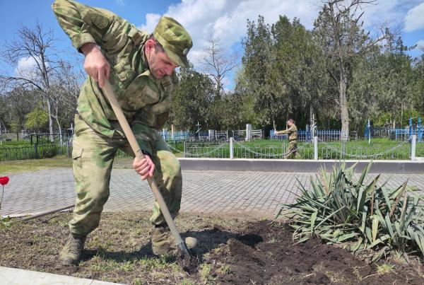 Мероприятие, приуроченное к 10-летию Росгвардии, было организовано в преддверии Дня Победы. Военнослужащие ОГВ(с) покосили траву, убрали мусор, впереди – работы по покраске ограды кладбища и мест захоронения ветеранов.