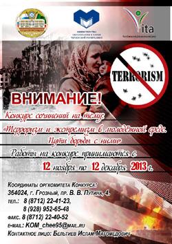 В рамках реализации плана по профилактике экстремизма и терроризма, формирования толерантности среди подрастающего поколения министерство Чеченской Республики по делам молодежи и министерство образования и науки ЧР проводят конкурс сочинений на тему: «Терроризм и экстремизм в молодёжной среде. Пути борьбы с ними».