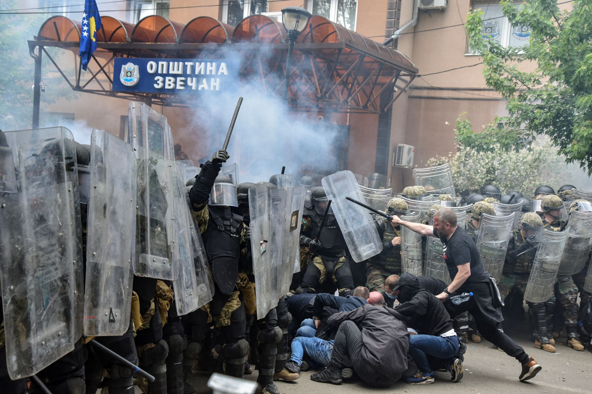 Тысячи косовских сербов собрались 29 мая перед муниципалитетами на севере края, требуя отвода спецназа и отзыва косовоалбанских мэров. Военнослужащих из контингента KFOR привлекли к охране зданий — они выстроили кордон, за которым стояла косовоалбанская полиция. Вечером в Звечане начались столкновения между сербами и силовиками. По протестующим открыли огонь, применили дубинки и светошумовые гранаты, распылили слезоточивый газ. В результате пострадали более 50 сербов и порядка 40 бойцов KFOR, в основном итальянцы и венгры.