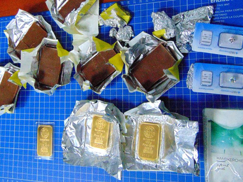 "Женщина пыталась пронести ценности через «зеленый» коридор и уклониться таким образом от уплаты таможенных платежей, но была остановлена инспекторами. Во время досмотра ее чемодана таможенники выявили золотые слитки, спрятанные в шоколадках «Аленка». В куртке пассажирки в упаковке бумажных платочков находились крупные бриллианты в завернутых в фольгу полимерных футлярах", - говорится в сообщении.