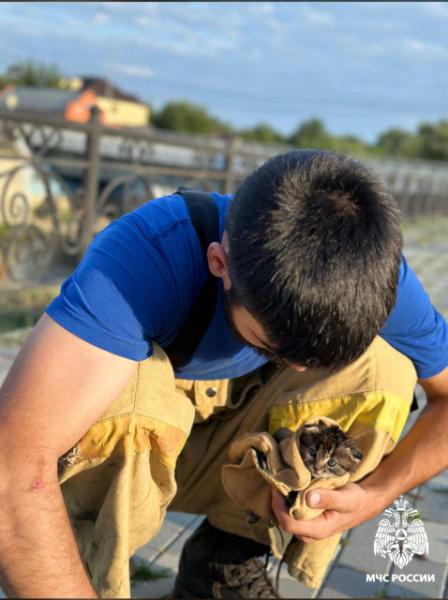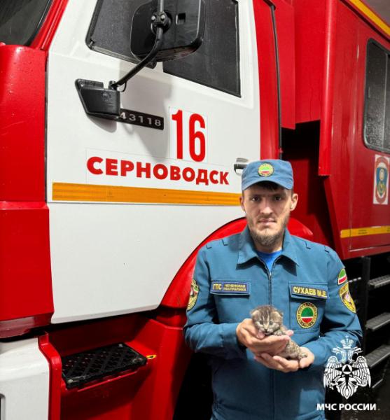Пожарные услышали жалобное мяуканье и среагировали мгновенно. Спасенного котенка облили холодной водой. В МЧС по Чеченской Республике сообщают, что ветеринарная помощь животному не потребовалась.