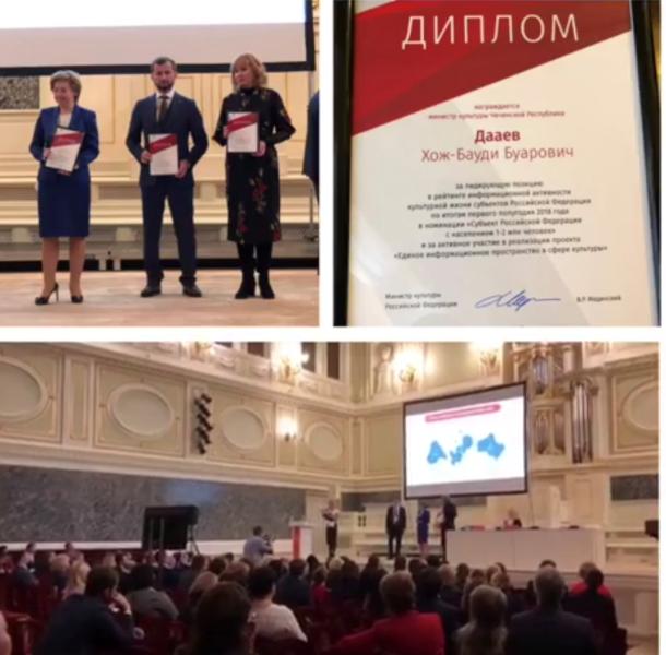 Как сообщает пресс-служба Главы и Правительства ЧР, министру культуры ЧР Хож-Бауди Дааеву вручен диплом за занятое первое место в рейтинге в номинации «Субъект Российской Федерации с населением 1-2 млн человек» и за активное участие в реализации проекта «Единое информационное пространство в сфере культуры».