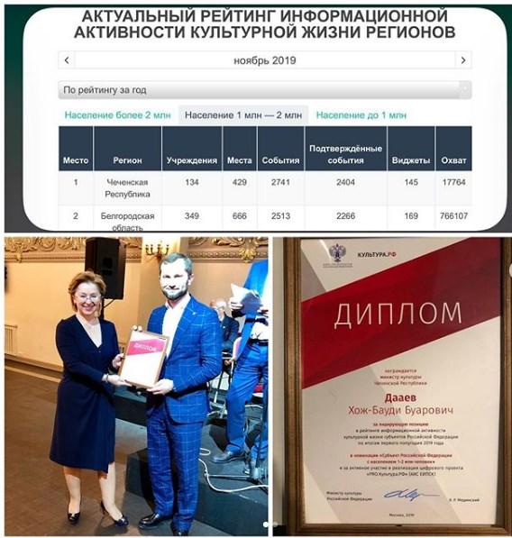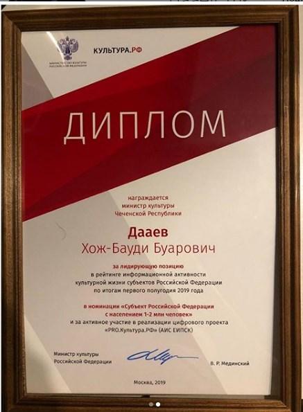 На проходящем в Санкт-Петербурге VIII Международном культурном форуме заместитель министра культуры РФ О.С.Ярилова вручила министру культуры Чеченской Республики Х.-Б.Дааеву диплом ,,За лидирующую позицию’’ по итогам первого полугодия 2019 года.
