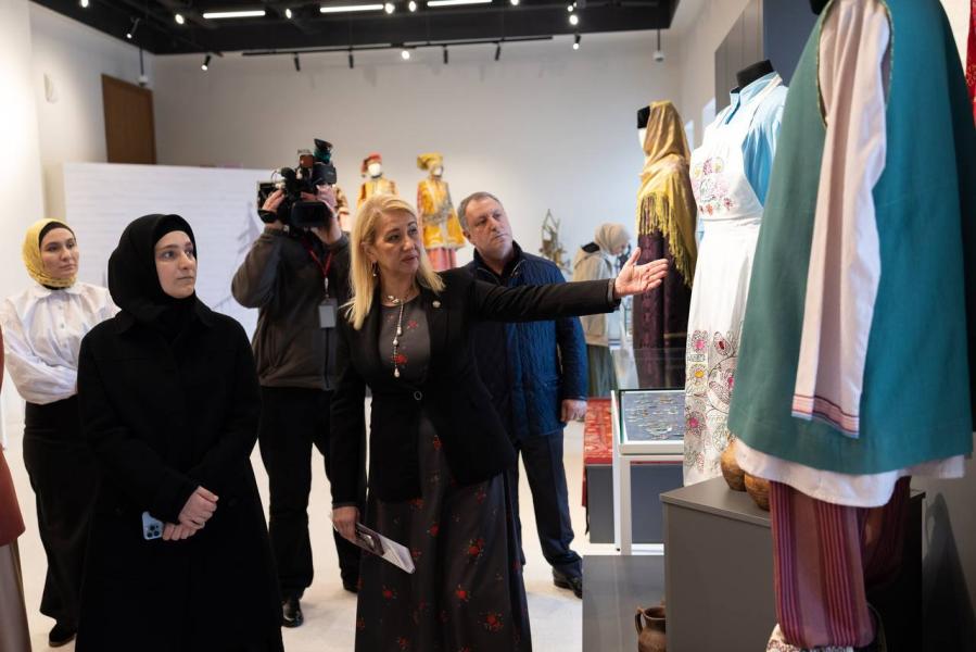 Далее представители ЧР побывали в Национальном музее республики Татарстан. Там Айшат Кадырова встретилась с директором музея Алисой Вяткиной. После взаимного обмена подарками министра культуры ЧР попросили оставить в книге почётных гостей музея памятную роспись.