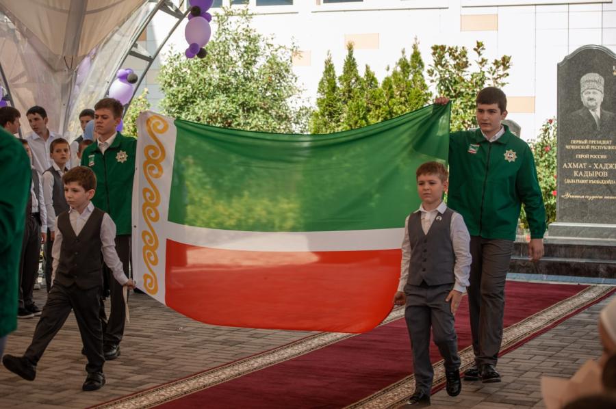 По новой традиции перед началом мероприятия учащиеся провели церемонию поднятия флагов России и ЧР. После ученики возложили цветы к мемориалу памяти Ахмата-Хаджи и его соратников.