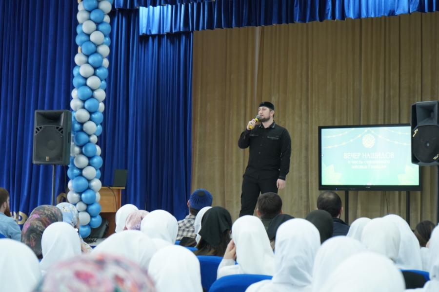 Для собравшихся в актовом зале зрителей нашиды исполнили солисты Департамента культуры Грозного Аслан Сулейманов, Мухаммад Джабраилова и девичьей группы религиозных песнопений «Ан-Нисаъ».