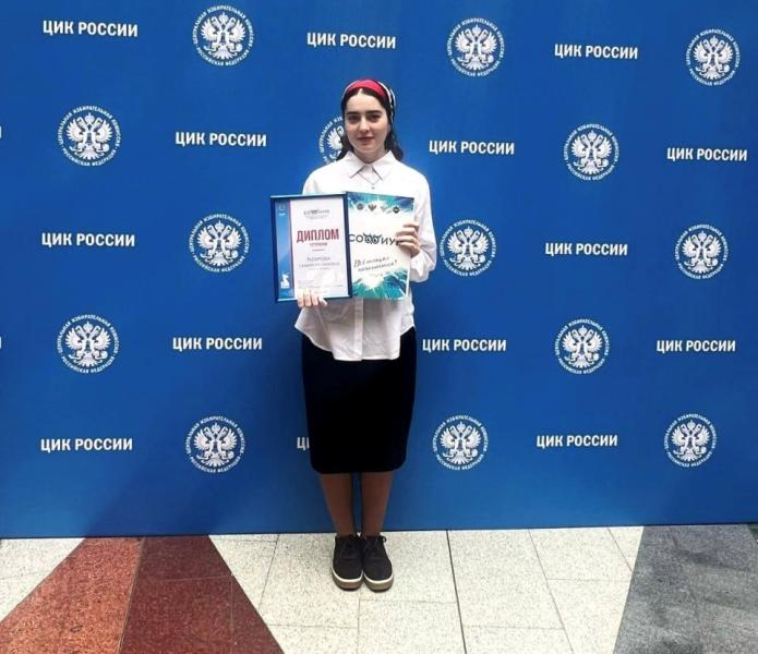 Ученица 11 класса МБОУ «Дышне-Веденская СОШ им. Дебишева К.Б» достойно представила Чеченскую Республику среди 90 финалистов из 44 регионов России. Своими знаниями и упорством она завоевала диплом I степени, который ей вручил заместитель председателя Центральной избирательной комиссии РФ Николай Булаев.
