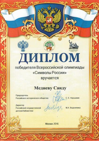 За организацию регионального этапа Всероссийской олимпиады «Символы России» директору ГБУ «РДБ им. С.В. Михалкова» Зулай Мадаевне Сайдумовой была вынесена Благодарность от организаторов конкурса в лице директора Российской государственной детской библиотеки М.А. Веденяпиной.