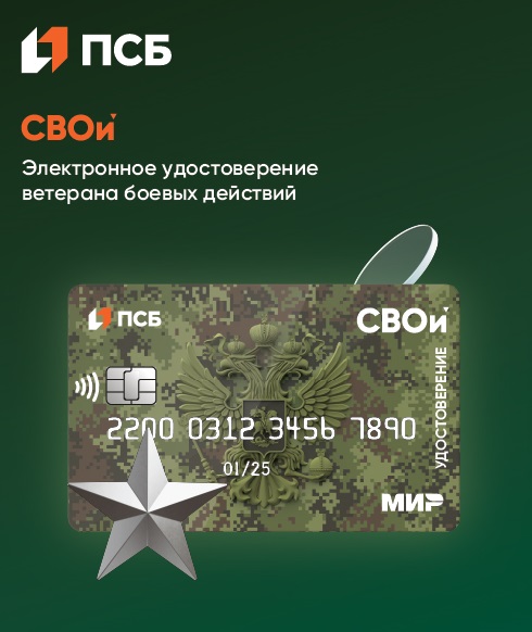 ПСБ первым в России начал выпуск многофункциональной карты «СВОи». Карта служит электронным удостоверением ветерана боевых действий, обеспечивая быстрый, простой и прозрачный процесс получения любых государственных социальных льгот по всей России, и одновременно является платежным инструментом с широким функционалом и специальными условиями от ПСБ.
