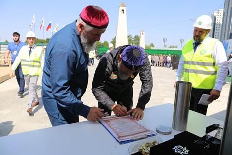 В завершении официальной части помощник главы ЧР, кадий Грозного Магомед Хийтанаев прочитал дуа. После чего, по старинной строительной традиции, почетные гости опустили в котлован капсулу с посланием потомкам.
