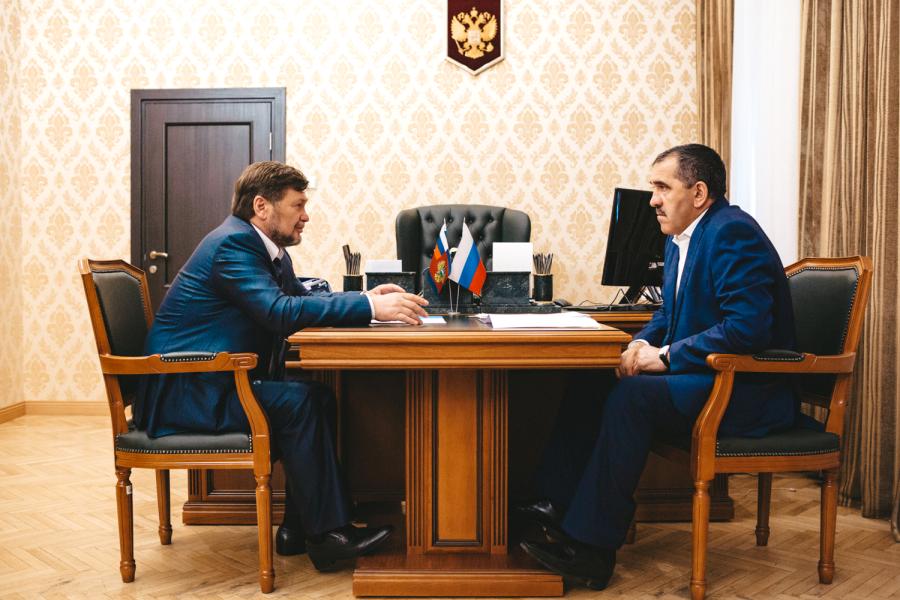 Сегодня в Минкавказе России состоялась рабочая встреча первого заместителя Министра Российской Федерации по делам Северного Кавказа, председателя Совета директоров АО «КРСК» Одеса Байсултанова и Главы Республики Ингушетия Юнус-Бека Евкурова.