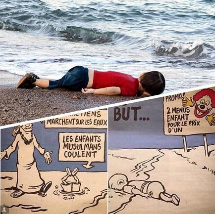 В последнем номере «Шарли Эбдо» появились серия карикатур с утонувшим мальчиком. На одной из них Айлан Курди лежит лицом в песке под надписью «два детских меню по цене одного». На другой - под заголовком «Доказательство, что Европа христианская» - стоящий на волнах Иисус Христос говорит маленькому беженцу: «Христиане ходят по воде. Мусульманские дети тонут».