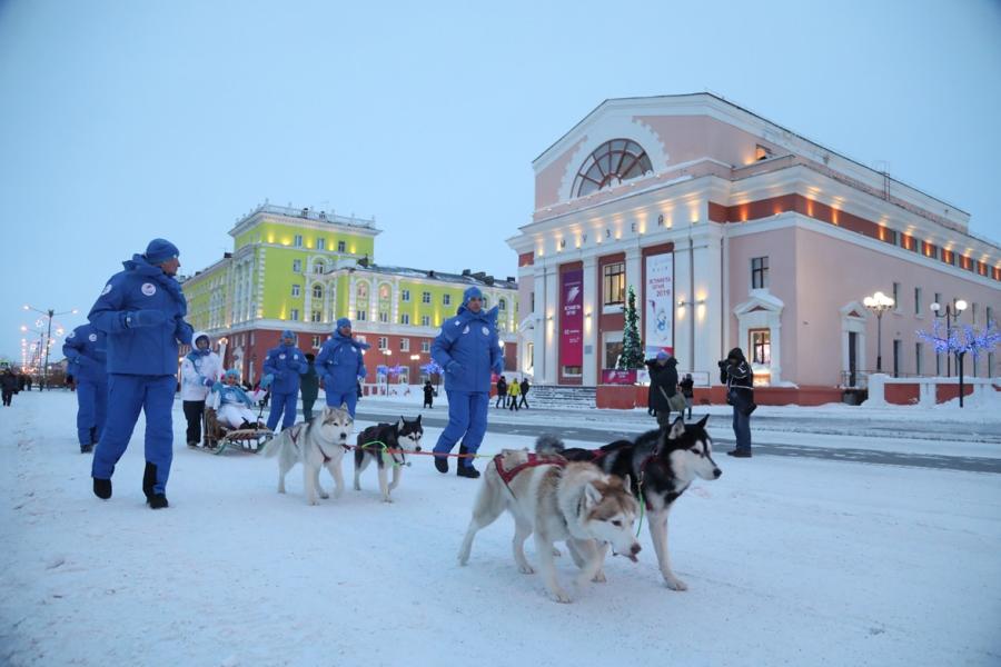 В Норильске участники Эстафеты стартовали около спортивно-развлекательного комплекса «Арена-Норильск». На маршруте были использованы оригинальные способы передвижения: на лыжах, снегоходе и даже на собачьей упряжке. Завершился этап Эстафеты на площади перед Дворцом спорта «Арктика».