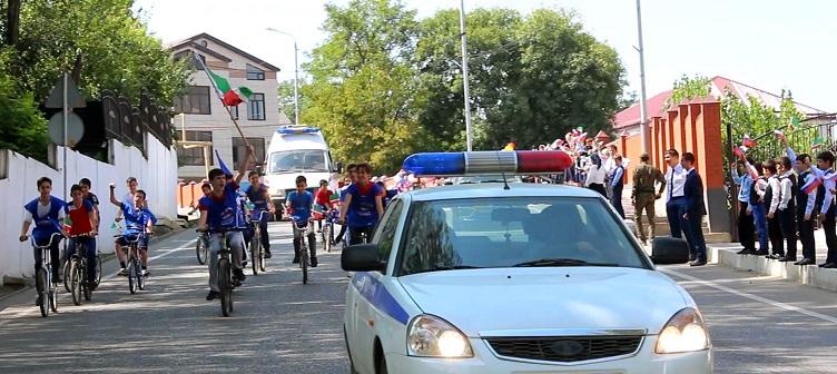 20 школьников на велосипедах в сопровождении партийцев Ножай-Юртовского местного отделения «Единой России», ОГИБДД ОМВД России по Ножай-Юртовскому району и скорой помощи проехались по центральной улице имени Ахмата-Хаджи Кадырова.