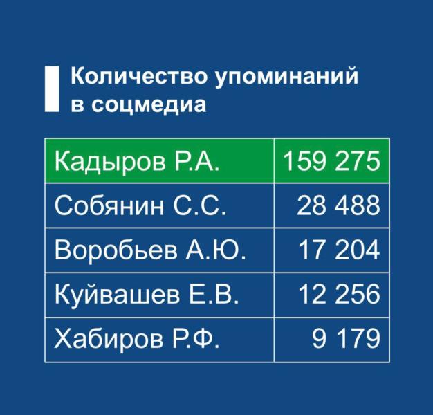 Согласно им, Глава ЧР с огромным отрывом опережает остальных участников рейтинга с количеством упоминаний в 159 275. На втором месте мэр Москвы Сергей Собянин (28 488), а на третьем - губернатор Московской области Андрей Воробьев (17 204).