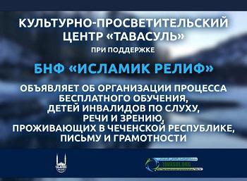Культурно-просветительский центр «Тавасуль» при поддержке некоммерческого благотворительного фонда «Исламик Релиф» проведет бесплатное обучение детей инвалидов по слуху, речи и зрению, проживающих в Чеченской Республике.