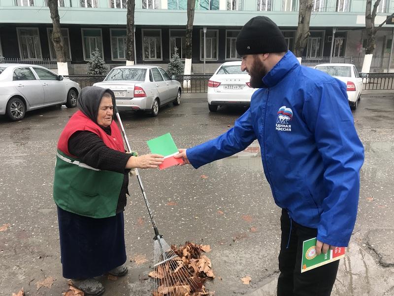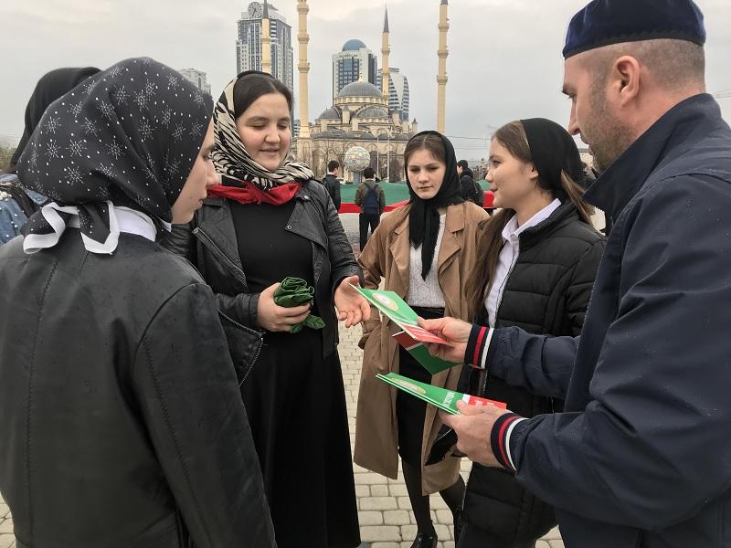 В канун празднования Дня принятия Конституции Чеченской Республики партийцы «Единой России» организовали традиционную акцию по раздаче брошюр с текстом главного нормативного закона и ленточек с изображением флага Чечни.