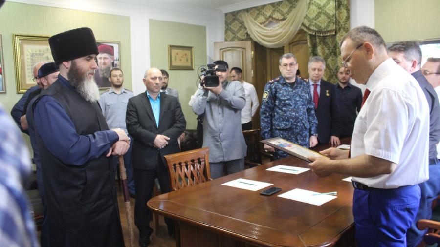 После содержательной беседы почетные гости искренне поблагодарили С. Межиева за теплый прием, за плодотворную работу по организации и проведению мероприятий по привлечению общественности к решению задач, стоящих перед уголовно-исполнительной системой, также выразили слова признательности и благодарности в адрес Главы ЧР Рамзана Ахматовича Кадырова за прекрасную республику, за высокие показатели во всем, за мир и благополучие жителей региона. Затем в торжественной обстановке почетные гости вручили муфтию ЧР Благодарственное письмо за вклад в дело укрепления законности и правопорядка на территории Чеченской Республики.