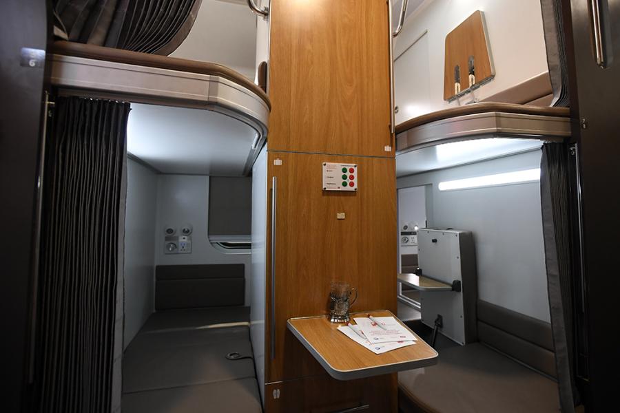 Как говорится, это привычный плацкартный вагон, но с индивидуальным пространством. Полки разделены перегородкой в виде шкафа, кроме того, у каждого пассажира будет свой личный стол и шторки на полках. Стены выполнены в светлых тонах, полки - в бежевых.