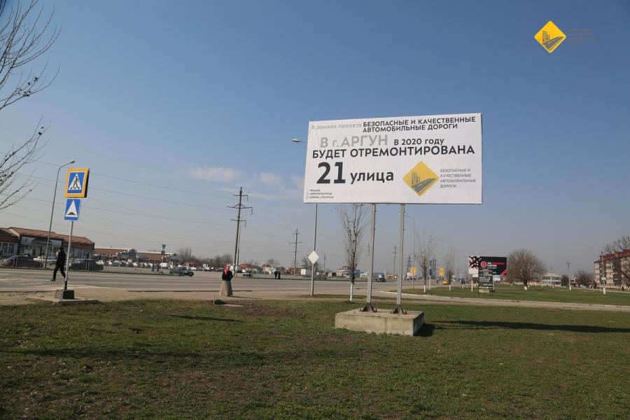 На въездах в город со стороны г.Гудермес (ул. А.А.Кадырова), г. Шали (ул. Шоссейная) и на ул. И.Аксактемирова установлены баннеры, гласящие о том, что в Аргуне в рамках нацпроекта «Безопасные и качественные автомобильные дороги» в 2020 году будет отремонтирована 21 улица.