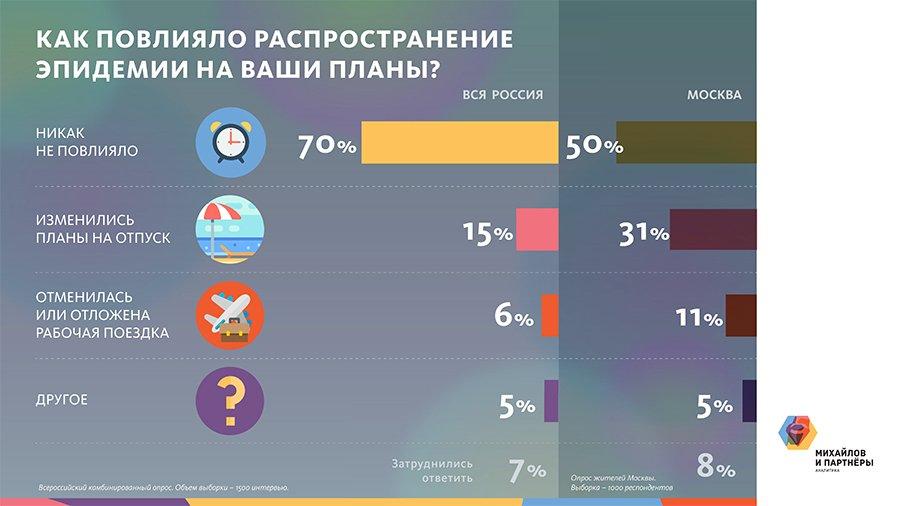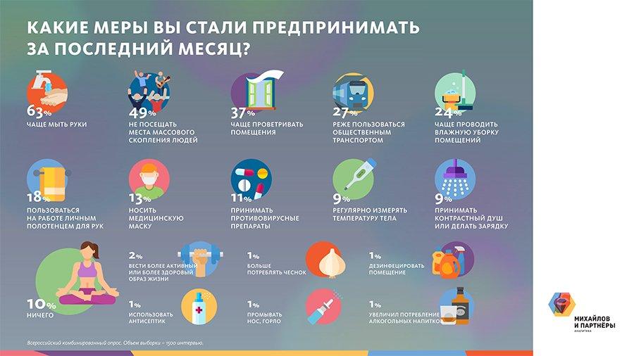 Коронавирус повлиял на планы россиян и их повседневную жизнь. У 15% из них изменились планы на отпуск, 6% отменили рабочие поездки. 63% заявили, что стали чаще мыть руки, 46% ограничили посещение массовых мероприятий, 37% начали чаще проветривать помещения, 27% — реже ездить общественным транспортом. Почти столько же начали чаще делать влажную уборку. Каждый десятый заявил, что не предпринимал ничего.