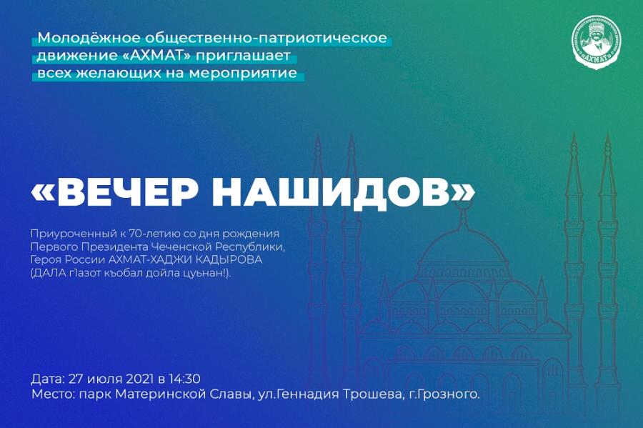 В Грозном состоится вечер нашидов, приуроченный к 70-летию со дня рождения Первого Президента Чеченской Республики, Героя России Ахмата-Хаджи Кадырова. Мероприятие организовано молодёжным общественно-патриотическим движением «Ахмат».
