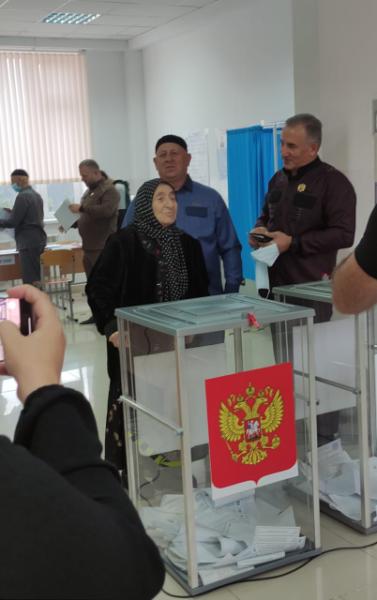 На избирательный участок №114 в городе Гудермес Р. Лечхаджиев пришел вместе с матерью, которая также проголосовала.
