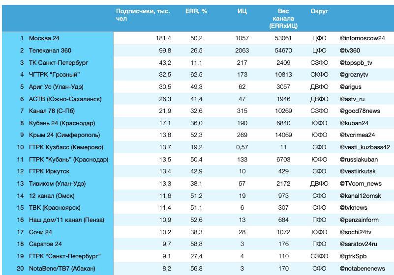 В топ-20 региональных телеканалов по кол-ву подписчиков в Telegram и их уровень вовлеченности аудитории четыре ГТРК.