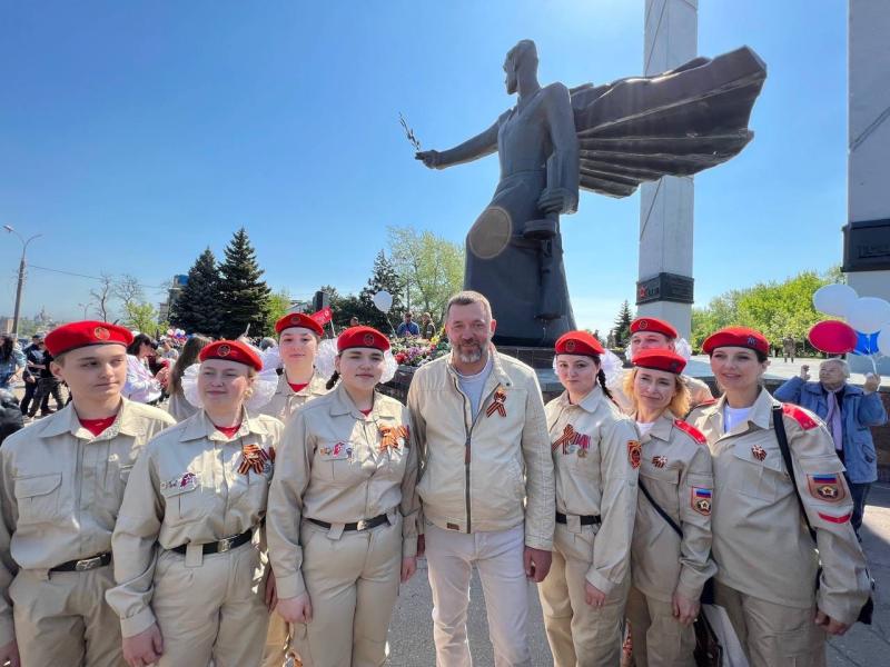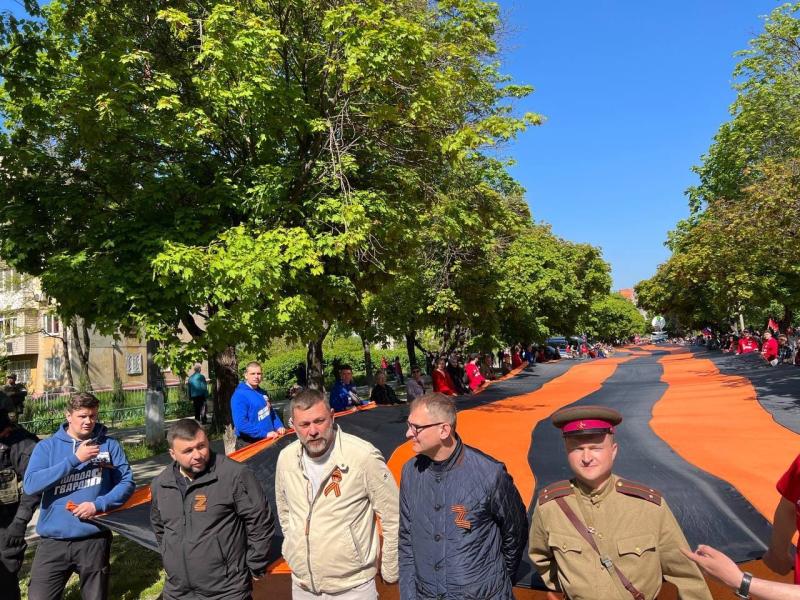 В ходе памятных мероприятий волонтеры МГЕР развернули 300-метровую Георгиевскую ленту и пронесли её до монумента «Воину-освободителю Донбасса». Это самая большая в мире Георгиевская лента – её площадь составляет 2100 кв. метров.
