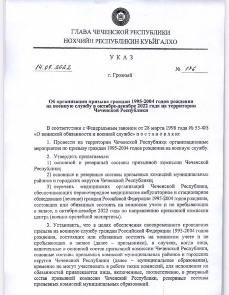 В социальных сетях и мессенджерах распространяется указ об организации призыва граждан 1995-2004 годов рождения на военную службу в октябре-декабре 2022 года на территории Чеченской Республики, обосновывая это тем, что данный призыв связан со специальной военной операцией на Украине.