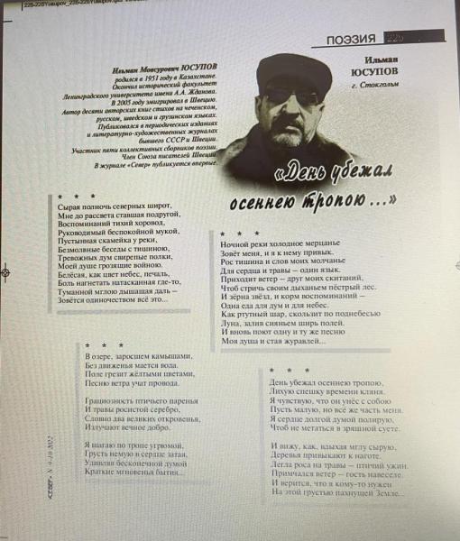 В литературно-художественном журнале "Север", который выходит в Карелии под эгидой Союза писателей России, вышла подборка стихотворений известного чеченского поэта Ильмана Юсупова "День убежал осеннею тропою...". Об этом ИА «Грозный-информ»сообщили в пресс-службе Союза писателей ЧР.