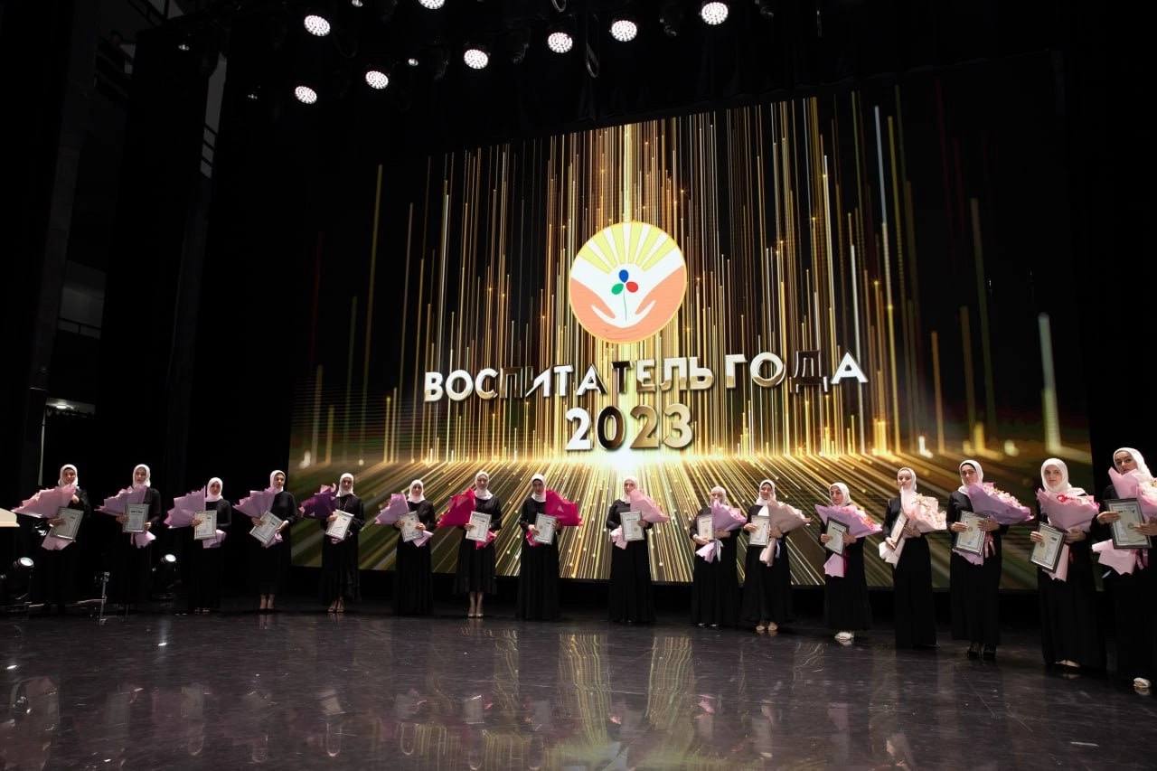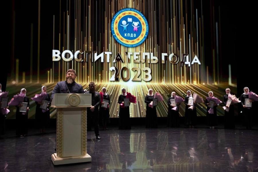 Глава Чеченской Республики Рамзан Кадыров принял участие в торжественной церемонии, посвященной итогам Республиканского конкурса профессионального мастерства "Воспитатель года-2023". Мероприятие прошло на сцене Дворца торжеств имени Дагуна Омаева в Грозном.