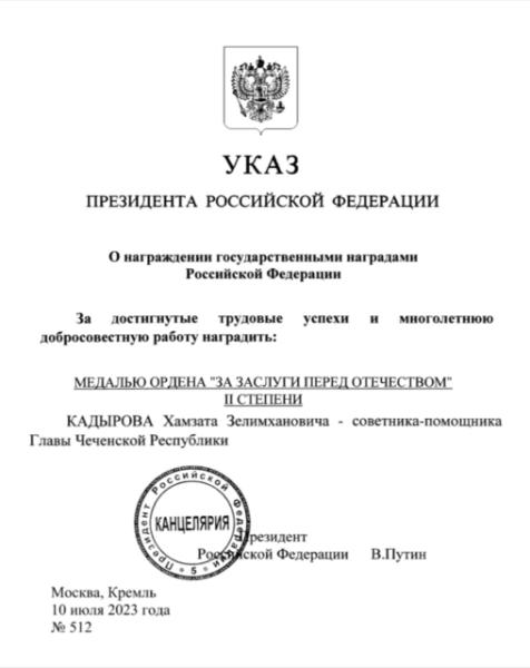 Накануне Указом Президента РФ Хамзат Кадыров награждён медалью ордена «За заслуги перед Отечеством» II степени. Награда вручена за достигнутые трудовые успехи и многолетнюю добросовестную работу.