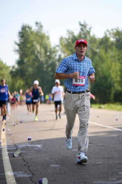 Он преодолел 21,1 километра за 1 час 48 минут. По его словам, бежать в брюках и рубашке было комфортно, а вот обувь оказалась неудобной.