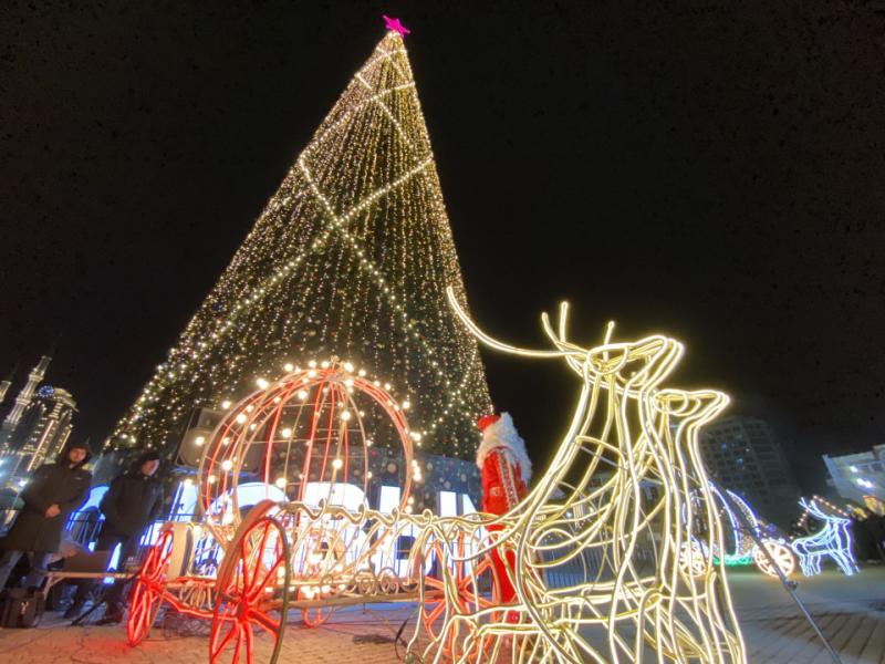 Новогодняя елка в Грозном готова радовать гостей, зеленая красавица уже в полном наряде.