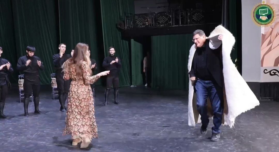 Известному американскому военному эксперту Скотту Риттеру преподнесли в подарок национальную бурку чеченцев. Надев ее, гость смог приобщиться к чеченской культуре и впервые в жизни станцевать лезгинку под песню заслуженного артиста РФ и народного артиста ЧР Ильяса Эбиева.