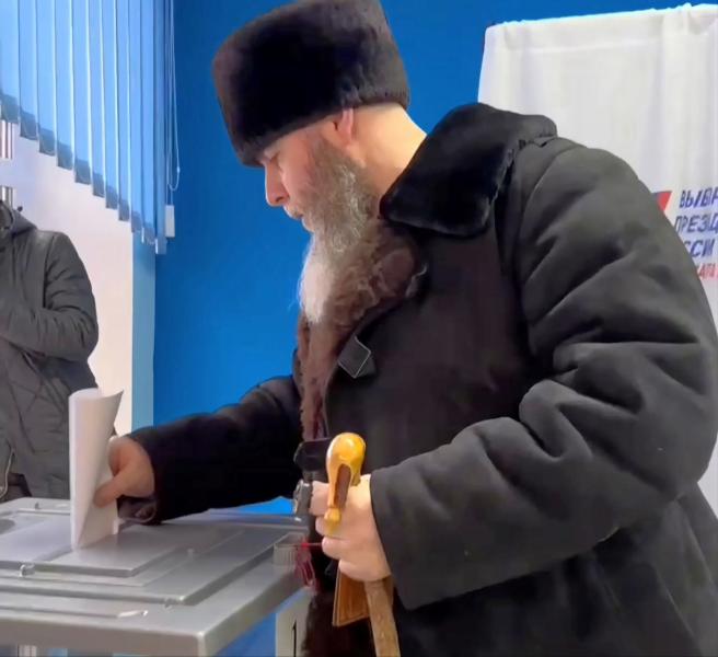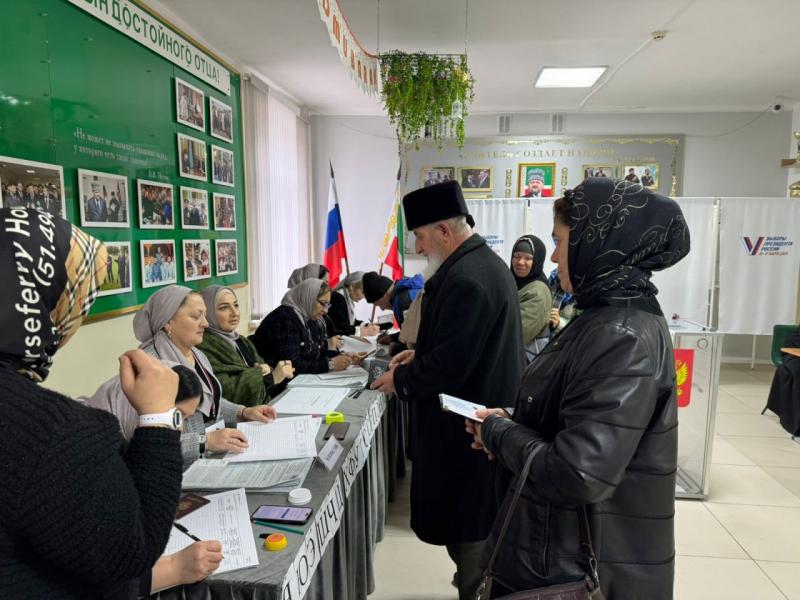Муфтий Чеченской Республики Салахь-Хаджи Межиев и члены его семьи проголосовали на выборах Президента России на избирательном участке № 402 в Грозном.