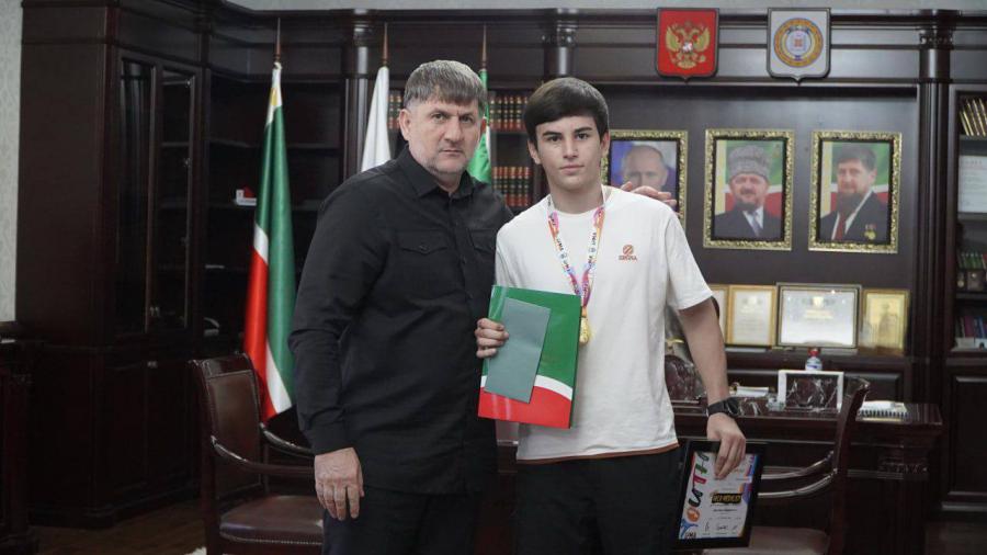 Глава Гудермесского района Хамзат Магамадов встретился с Раджапом Магомадовым - чемпионом мира по тайскому боксу в возрастной категории 16-17 лет, и его тренером Лом-Али Муцаевым.
