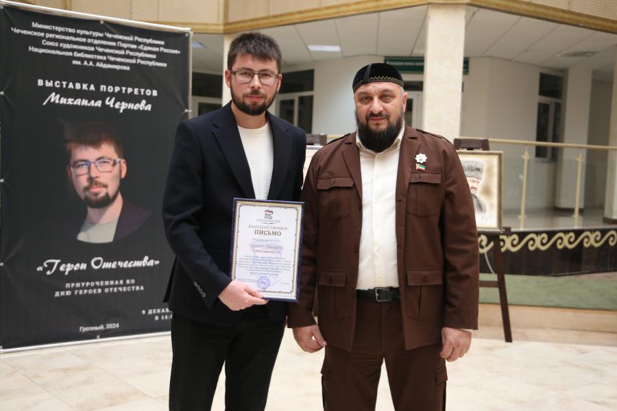 Художник Михаил Чернов представил экспозицию из 29 портретов Героев и выдающихся деятелей Чечни. Выставка разместилась в Национальной библиотеке Чеченской Республики им. А.А. Айдамирова в Грозном.