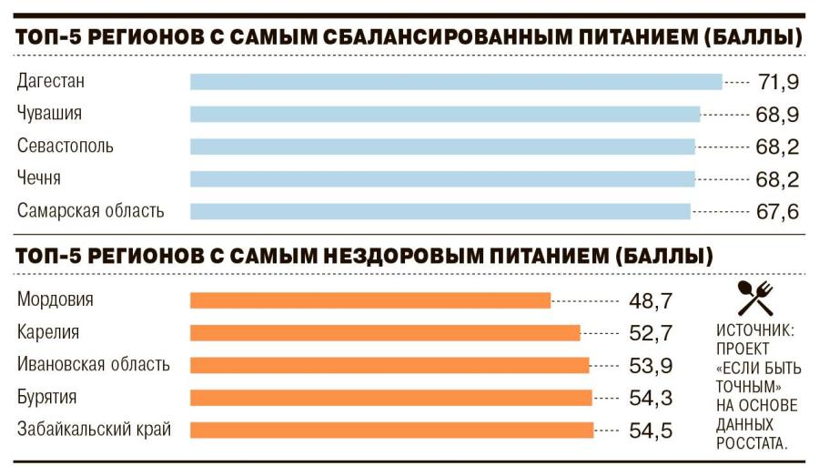 Хуже всего питаются жители Мордовии, Карелии, Ивановской области, Бурятии, Тувы, Забайкальского края и ЕАО. А наиболее сбалансированное питание у жителей Чечни, Дагестана и Чувашии.