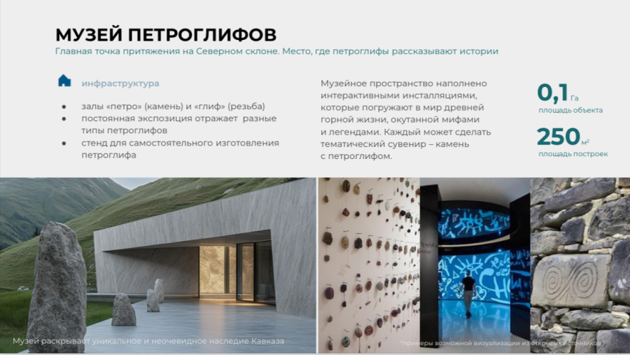 «Большую часть объектов в планах разместить на Южном склоне: конный центр, амфитеатр, кемпинг, ресторан горной кухни, спортивные, детские и спа- центры. А строящийся сегодня Северный склон украсят мечеть «Свет в горах» и музей петроглифов. В местном корнере будут подавать традиционные лепешки чепалгаш, а в чайной заваривать сбор со вкусом гармонии и уюта», - рассказали в пресс-службе компании «КАВКАЗ.РФ».
