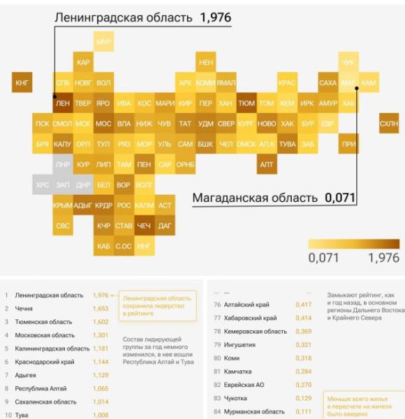 По итогам прошедшего года Ленинградская область сохранила лидирующую позицию в рейтинге с показателем 1,976 кв. м введенного жилья на одного человека. Второе место занимает Чеченская Республика.