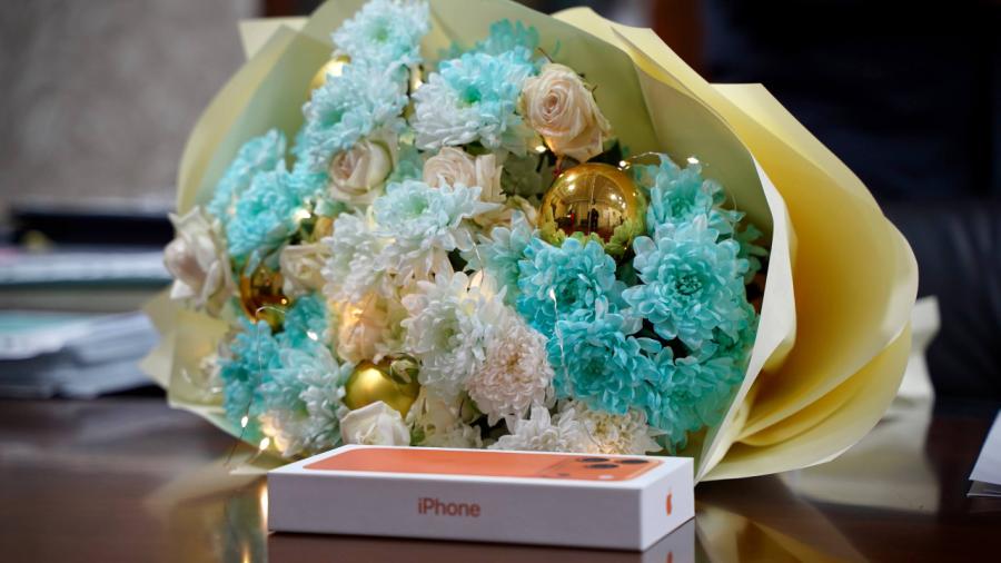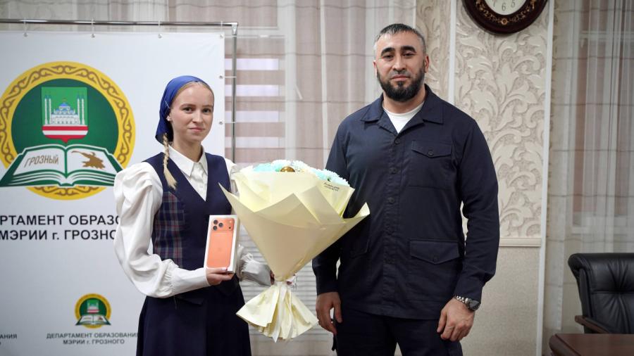 Заместитель мэра — начальник Департамента образования мэрии Грозного Зелимхан Ахматов встретился с Софьей, поздравил её с победой и вручил главный приз конкурса — iPhone 17 Pro Max, а также цветы.