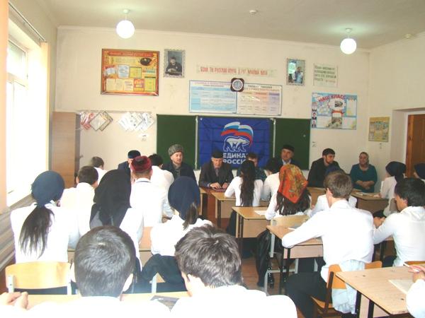 Так, представители Веденского местного отделения партии провели встречу с учащимися СОШ с. Октябрьское Веденского муниципального района. В мероприятии приняли участие: глава администрации Веденского сельского поселения Иса Хадисов, имам мечети с. Октябрьское Ваха-Али Чагаев, представитель Веденской районной администрации, участник КТО Хусайн Гудаев, главный специалист-эксперт отдела министерства ЧР по делам молодежи Аюб Хадисов, руководитель местного исполкома Веденского местного отделения партии «Единая Россия» Яраги Сайдулаев.