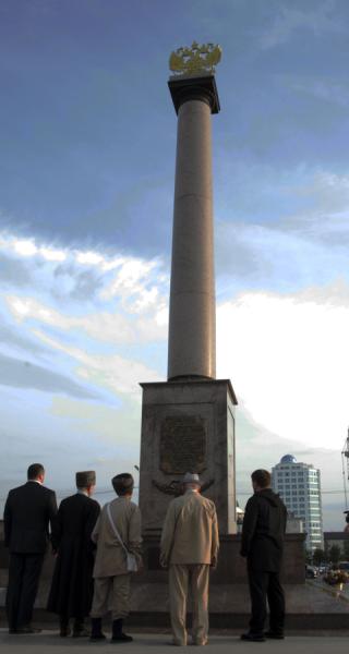 Колонну из красного гранита, по традиции, венчает на вершине герб Российской Федерации, а вокруг сооружения располагаются тумбы с барельефами, которые повествуют о военной эпохе прошлых лет.