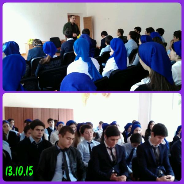 В гости к старшеклассникам пришли глава администрации Сунженского муниципального района М.А.-В.Ханариков и ведущий специалист-эксперт отдела территориальных представителей Министерства ЧР по делам молодежи М.Х.Ибрагимова. Основной темой обсуждения была общественно-политическая ситуация в республике через призму событий, разворачивающихся в Сирии.